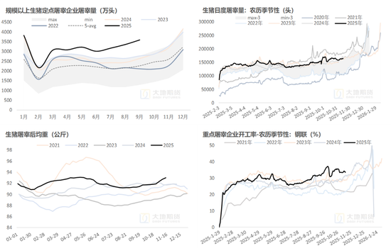 屠宰开工:偏多短时需求支撑一般,部分区域有零星腌腊启动,但温度还不够低无法成规模,关注下旬或月底温度再降及腌腊陆续启动所带来的需求增量幅度。