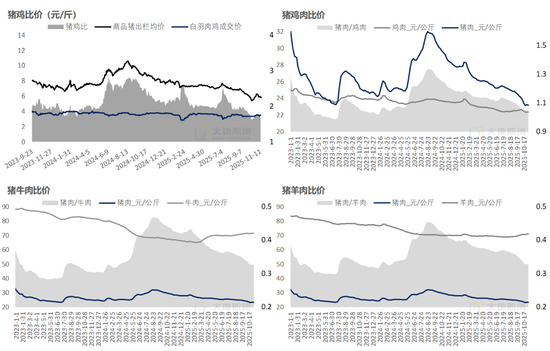 毛猪周内价格重心小幅下移,牛肉报价相对持稳,猪肉对牛比价0.32左右。猪肉对羊肉比价0.33左右;白羽肉鸡价格有所上调,猪价表现显弱,猪鸡比价小幅调降在1.67左右。