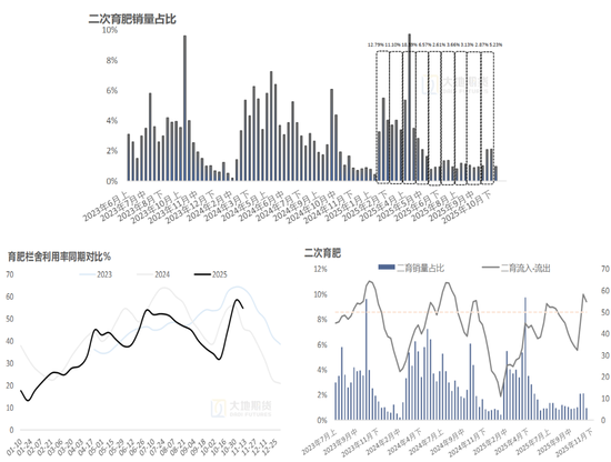 据涌益样本监测,11月上旬十天,部分头部企业销售二育量占近十天生猪销售量的比例为0.96%,较前十天-1.16%。